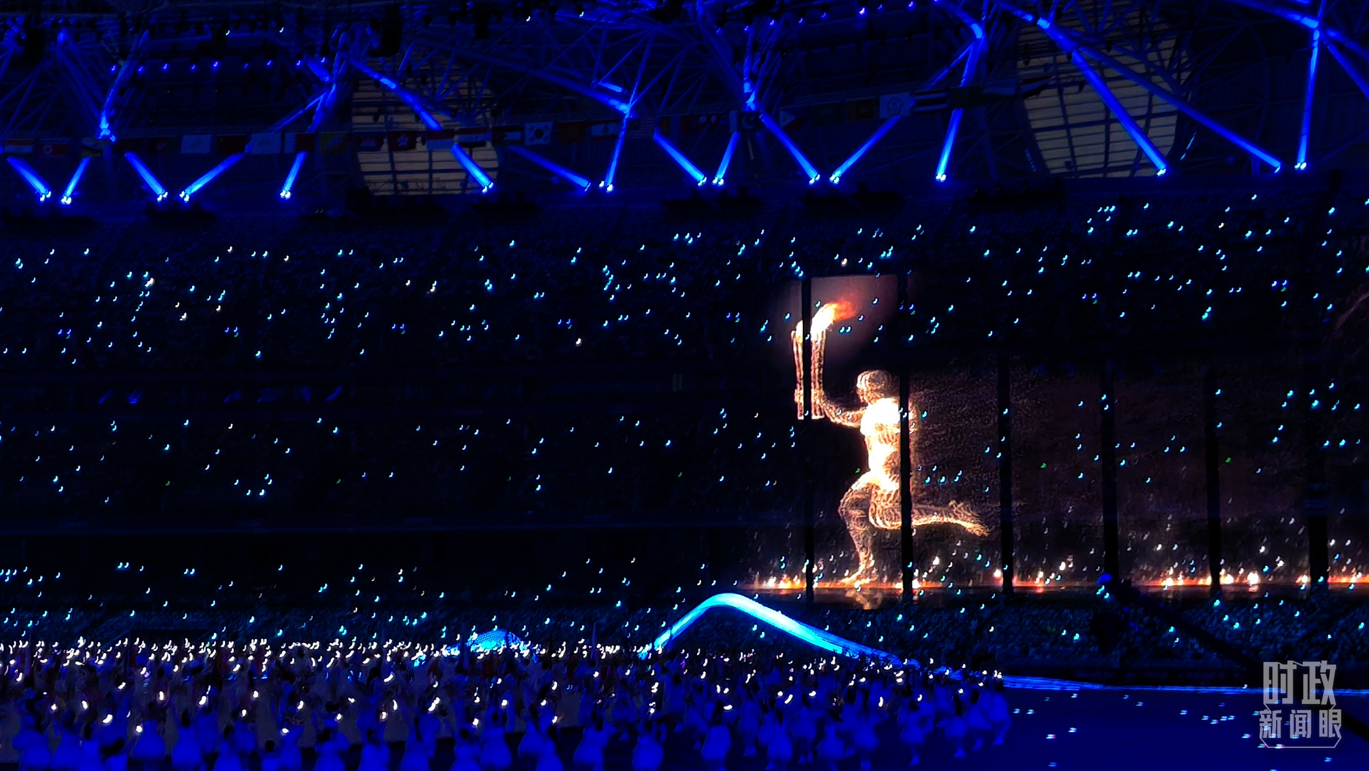 △"數(shù)字火炬手"入場,與現(xiàn)場火炬手共同點(diǎn)燃主火炬。(總臺央視記者王子杭、總臺國廣記者李晉拍攝)