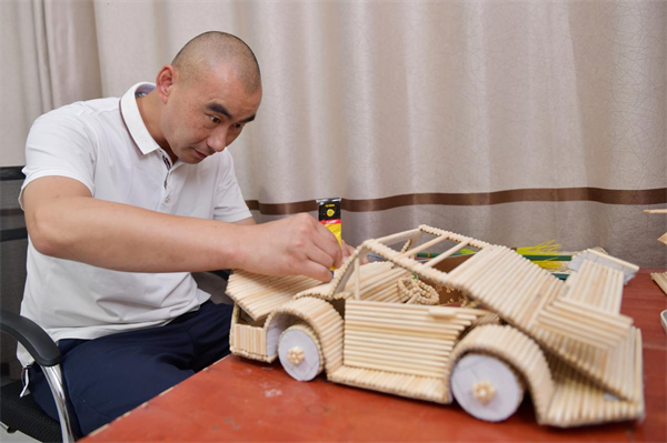 編制了一段時(shí)間的小手鏈、小掛件、小燈籠等等小工藝品后,楊波購買了一次性筷子自己做了一個(gè)煙盒。這個(gè)煙盒只要一按按鈕,煙支就會(huì)自動(dòng)彈出,而且煙嘴朝上。隨后,楊波又購買了許多一次性筷子,做一輛轎車模型,不曾想,等到了安裝擋風(fēng)玻璃時(shí),小轎車散架了。分析原因,是因?yàn)閳A柱狀筷子之間的粘和面積太小不牢靠。楊波找了一些紙板當(dāng)墊板,使筷子的粘和面變成2處,牢固程度提高1倍,前前后后有10多天,一輛筷子車模做成功了。