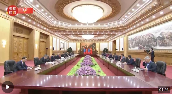 10月19日上午,國(guó)家主席習(xí)近平在人民大會(huì)堂會(huì)見(jiàn)來(lái)華出席第三屆“一帶一路”國(guó)際合作高峰論壇的蒙古國(guó)總統(tǒng)呼日勒蘇赫。