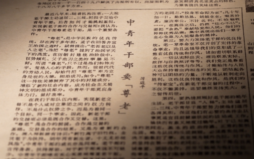 1984年12月7日,《人民日?qǐng)?bào)》第4版上發(fā)表了一篇評(píng)論——《中青年干部要“尊老”》,作者是時(shí)任河北正定縣委書記習(xí)近平。在論述“尊老”傳統(tǒng)美德時(shí),文章引經(jīng)據(jù)典,包括孟子的“老吾老以及人之老”等。全文篇幅不長(zhǎng),卻真實(shí)反映了習(xí)近平尊老敬老的深情厚意。