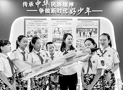 9月14日,內(nèi)蒙古自治區(qū)呼和浩特市玉泉區(qū)五塔寺東街小學(xué)學(xué)員們學(xué)習(xí)國防知識,增強國防觀念。丁根厚攝/光明圖片