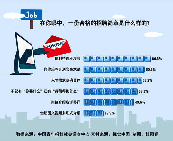 日前,中國(guó)青年報(bào)社社會(huì)調(diào)查中心聯(lián)合問卷網(wǎng)(wenjuan.com),對(duì)1334名應(yīng)屆大學(xué)生進(jìn)行的一項(xiàng)調(diào)查顯示,在他們眼中,一份合格的招聘簡(jiǎn)章,首先是福利待遇不浮夸(66.3%),其次是崗位培養(yǎng)計(jì)劃實(shí)事求是(60.3%),再次是人才需求明確具體(57.2%)。
