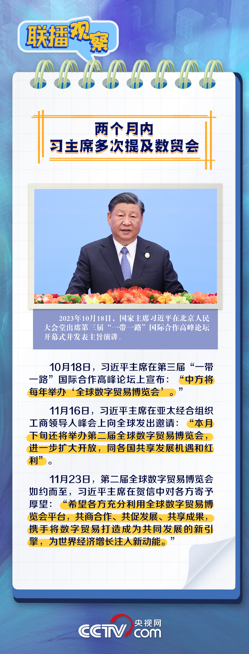 聯(lián)播+“當(dāng)前,全球數(shù)字貿(mào)易蓬勃發(fā)展,成為國際貿(mào)易的新亮點(diǎn)。”11月23日,習(xí)近平主席向第二屆全球數(shù)字貿(mào)易博覽會(huì)致賀信,回顧了近年來中國為全球數(shù)字貿(mào)易蓬勃發(fā)展付出的努力,并對與會(huì)各方寄予厚望。