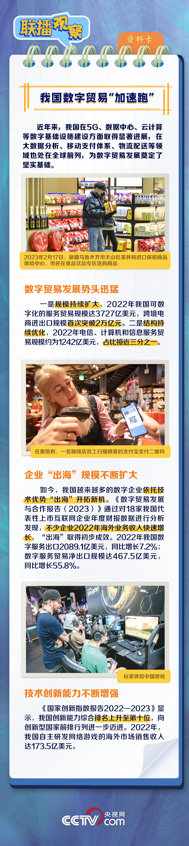 當(dāng)前,貨物貿(mào)易和服務(wù)貿(mào)易都呈現(xiàn)出不可逆的數(shù)字化轉(zhuǎn)型趨勢。什么是數(shù)字貿(mào)易?本屆數(shù)貿(mào)會(huì)有什么看點(diǎn)和亮點(diǎn)?我國數(shù)字貿(mào)易有何發(fā)展成果?央視網(wǎng)《聯(lián)播觀察》與您一同了解。