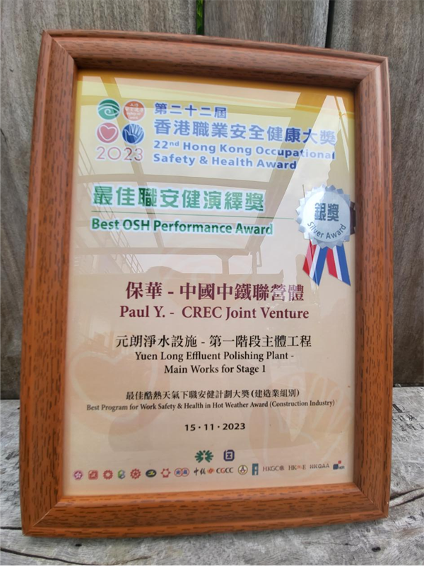近日,由香港特別行政區(qū)職業(yè)安全健康局舉辦的“第二十二屆香港職業(yè)安全健康大獎分享會暨頒獎典禮”在香港會議展覽中心舉行,大獎通過嘉許致力推行工作安全及健康措施的機(jī)構(gòu),提高各界的職安健表現(xiàn)。會上,由中鐵一局一公司參與承建的香港元朗凈水設(shè)施——第一階段主體工程項目喜獲建造業(yè)組別“最佳酷熱天氣職安健計劃大獎——金獎”“最佳職安健演繹獎——銀獎”兩項大獎。