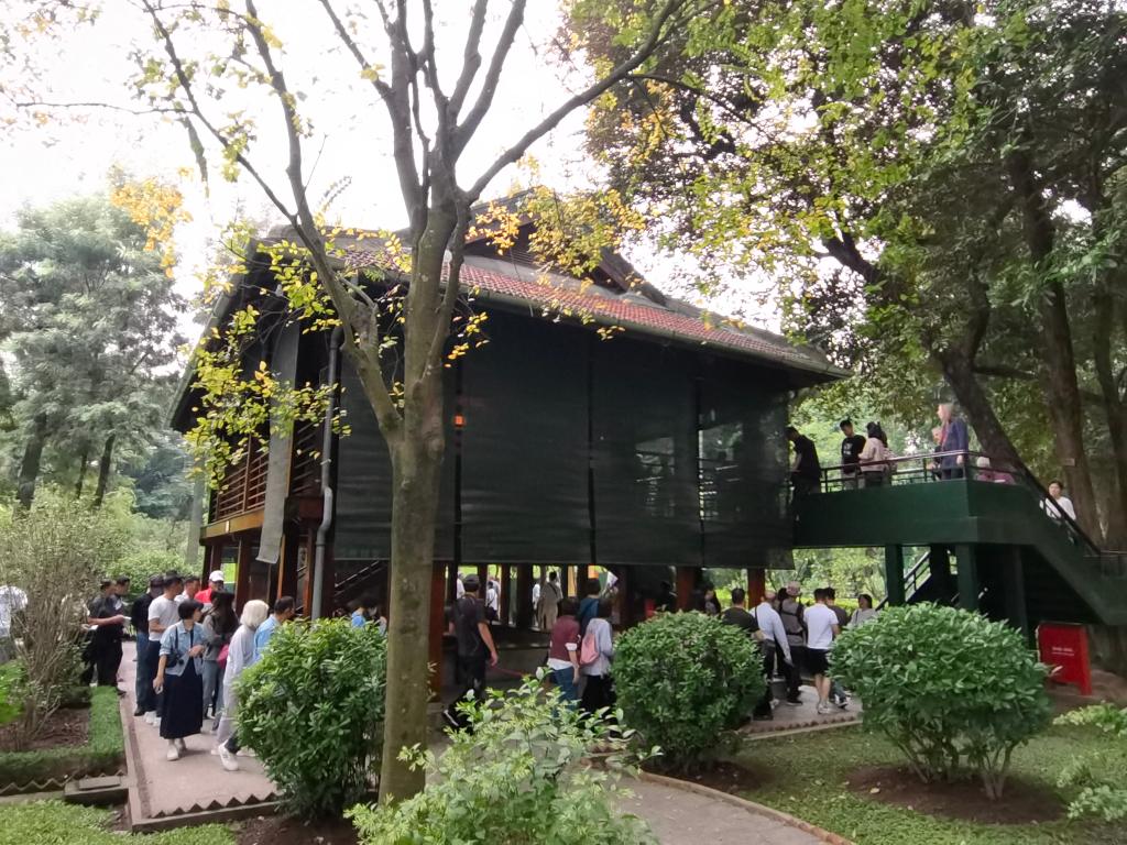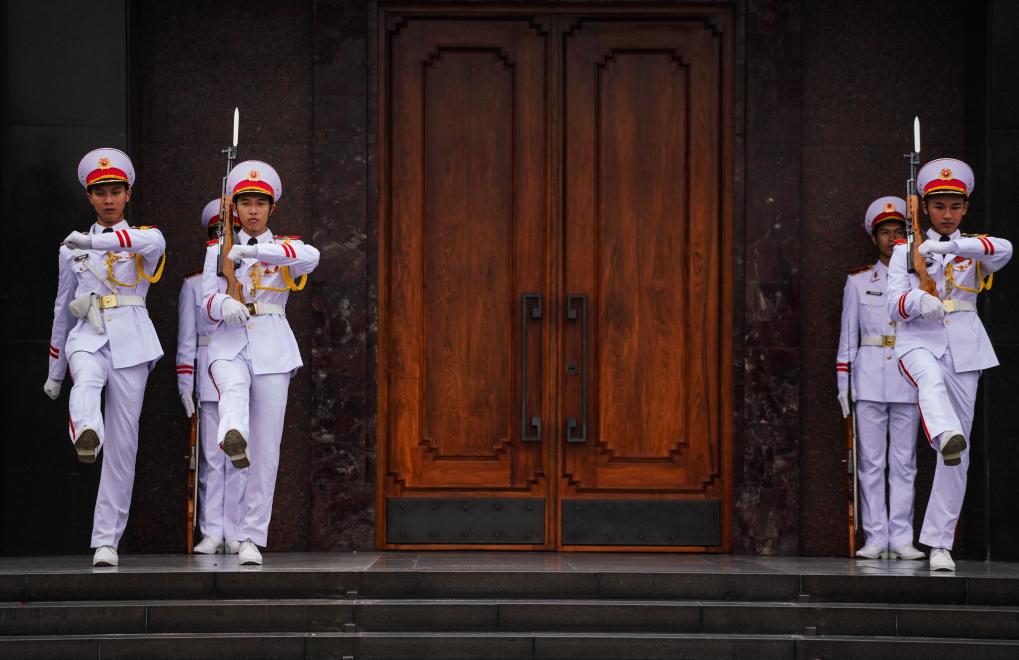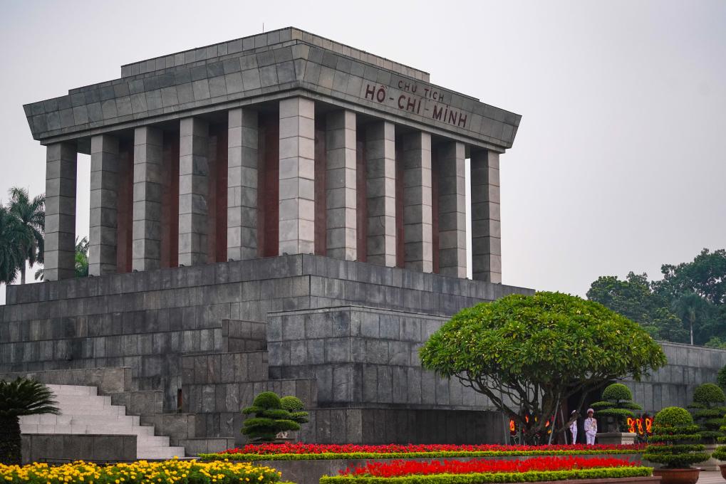 在河內(nèi)地標(biāo)巴亭廣場(chǎng)一側(cè),坐落著胡志明陵和胡志明故居。記者抵達(dá)廣場(chǎng)時(shí),守衛(wèi)胡志明陵的儀仗兵正在舉行換崗儀式,眾多民眾和游客高舉相機(jī)或手機(jī),記錄下這莊嚴(yán)肅穆的一刻。胡志明陵北側(cè)的胡志明故居內(nèi),各國游客排起長隊(duì),在他曾長期居住和工作的高腳屋下駐足留影。
