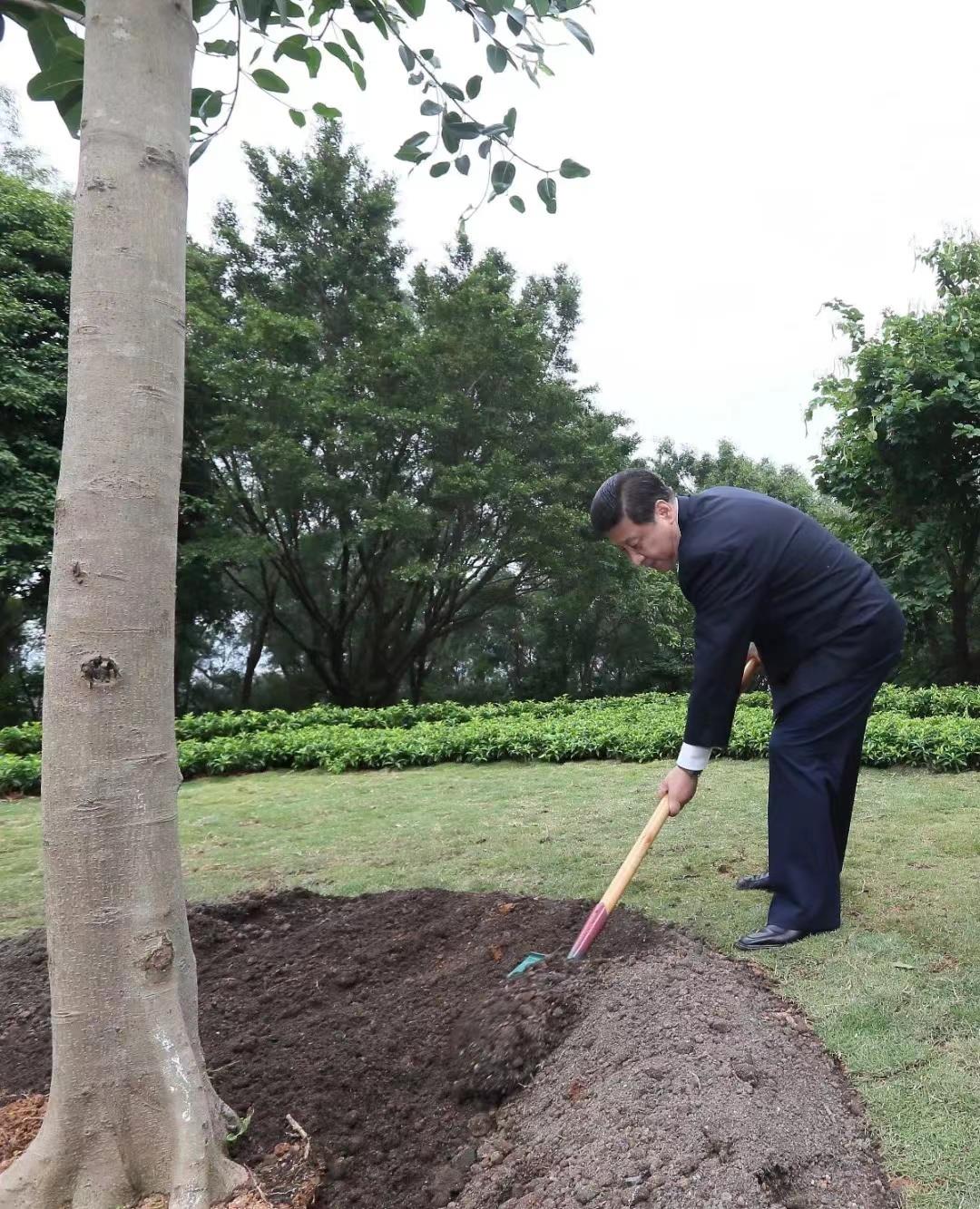 △2012年12月8日,習(xí)近平總書(shū)記在深圳蓮花山公園,向鄧小平銅像敬獻(xiàn)花籃。離開(kāi)前,他揮鍬鏟土,種下一棵高山榕樹(shù)。