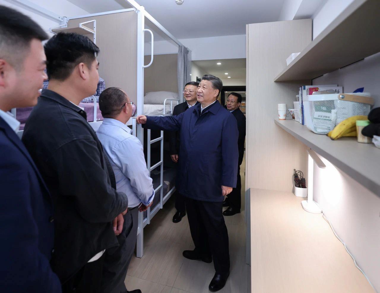 習(xí)近平總書(shū)記走進(jìn)出租房社區(qū),有一棟樓是宿舍型出租房源。其中一個(gè)四人間,租戶(hù)都是附近物業(yè)公司的保安。他們說(shuō):“這里有公共的廚房、洗衣房、浴室,還有會(huì)客室,外面有羽毛球場(chǎng)、籃球場(chǎng),蠻好、蠻好!”