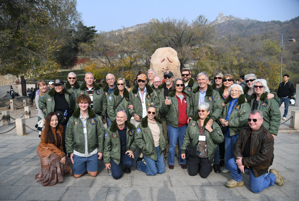 2023年10月29日,飛虎隊老兵莫耶一行人在北京八達嶺長城合影留念。當(dāng)日,美中航空遺產(chǎn)基金會訪華代表團成員陸續(xù)抵達北京。新華社記者 任超 攝