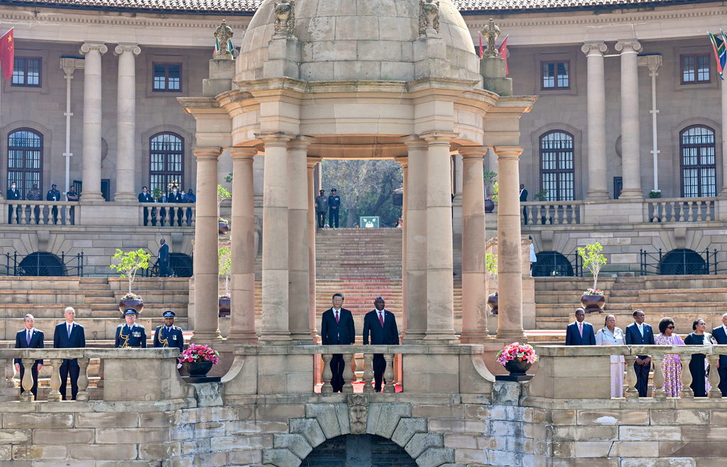 當(dāng)?shù)貢r(shí)間2023年8月22日上午,正在南非進(jìn)行國(guó)事訪問(wèn)的國(guó)家主席習(xí)近平在比勒陀利亞總統(tǒng)府同南非總統(tǒng)拉馬福薩會(huì)談。會(huì)談前,拉馬福薩在總統(tǒng)府廣場(chǎng)為習(xí)近平舉行歡迎儀式。