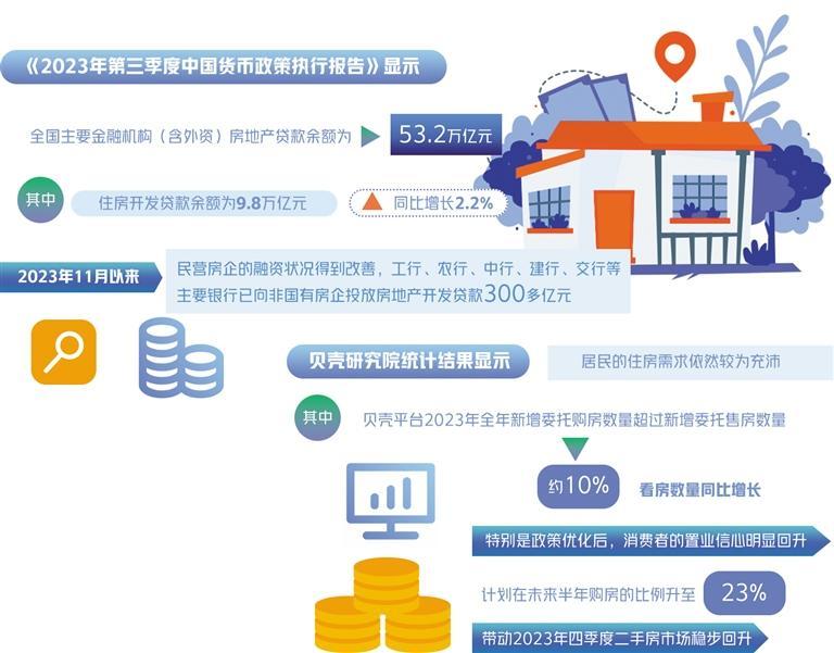 從銀行信貸角度看,房地產信貸融資的規(guī)模、結構整體穩(wěn)定。《2023年第三季度中國貨幣政策執(zhí)行報告》顯示,全國主要金融機構(含外資)房地產貸款余額為53.2萬億元,其中,住房開發(fā)貸款余額為9.8萬億元,同比增長2.2%。2023年11月以來,民營房企的融資狀況得到改善,工行、農行、中行、建行、交行等主要銀行已向非國有房企投放房地產開發(fā)貸款300多億元。