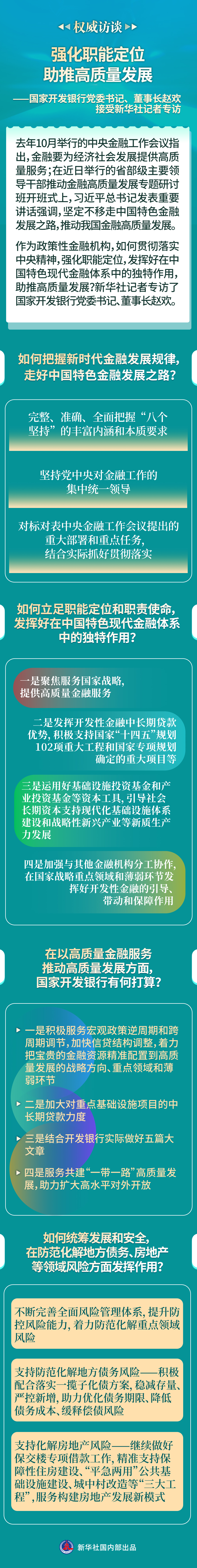 作為政策性金融機構(gòu),如何貫徹落實中央精神,強化職能定位,發(fā)揮好在中國特色現(xiàn)代金融體系中的獨特作用,助推高質(zhì)量發(fā)展?新華社記者專訪了國家開發(fā)銀行黨委書記、董事長趙歡。