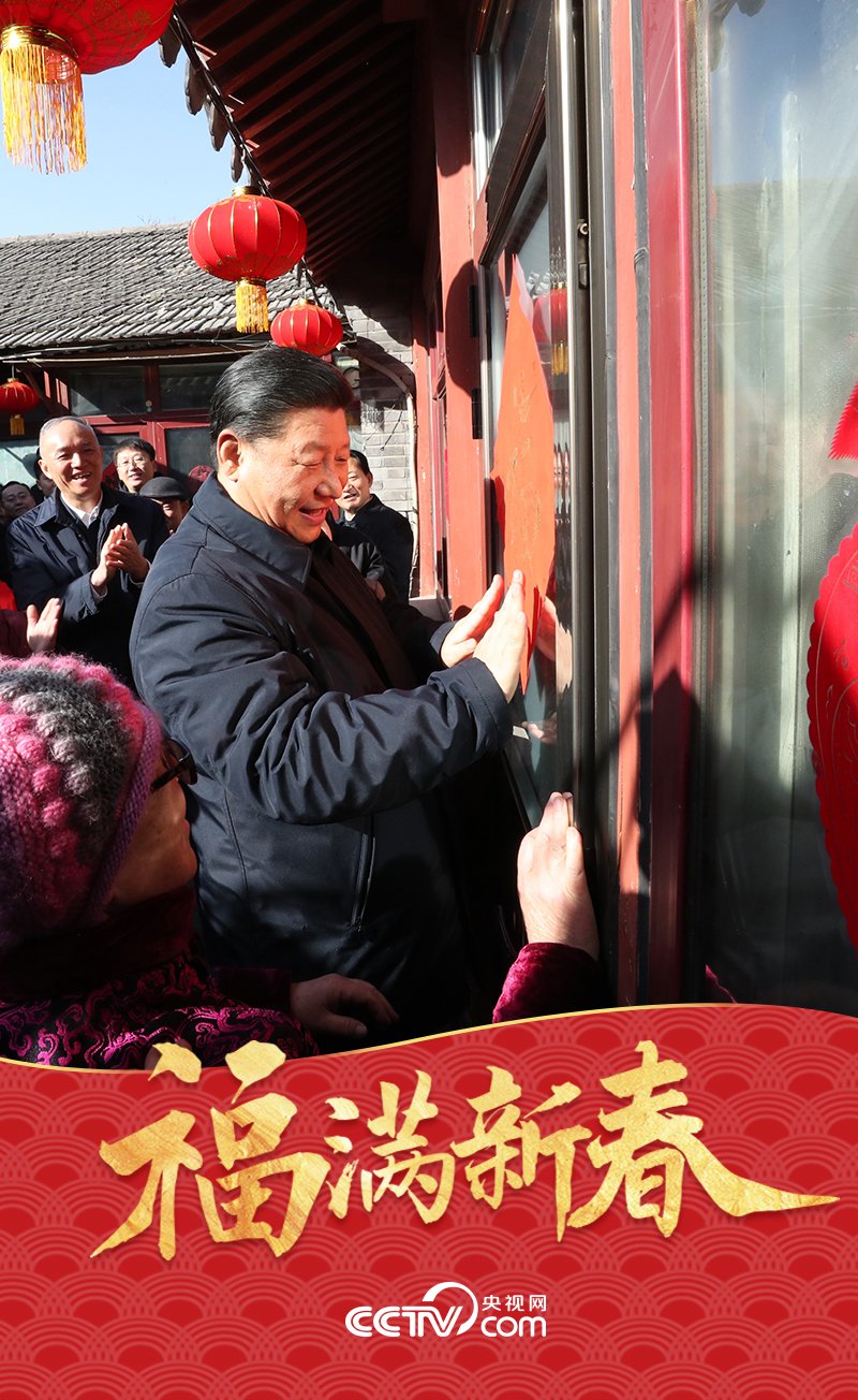 2019年2月1日,在北京前門東區(qū)草廠四條胡同32號(hào)小院,居民們熱情邀請(qǐng)前來(lái)拜年的總書(shū)記一起貼“福”字??倳?shū)記興致勃勃地拿起一幅紅底金色大“福”字,嫻熟地貼在大門上。他對(duì)居民們說(shuō):希望咱們街坊鄰居們永遠(yuǎn)幸福。