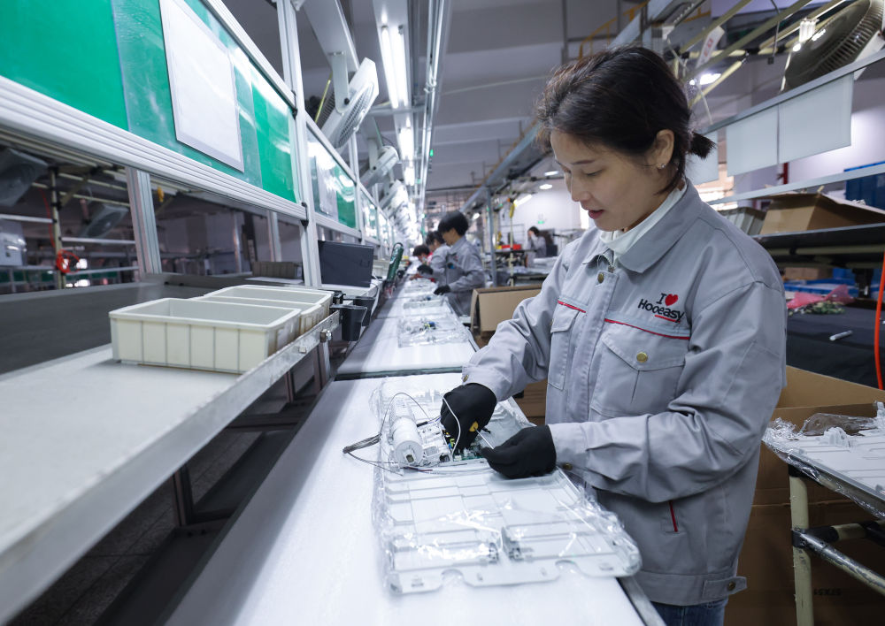 2月19日,工人在位于浙江金華市金義新區(qū)的浙江好易點(diǎn)科技股份有限公司車間內(nèi)組裝智能晾衣機(jī)。據(jù)介紹,該公司已形成年產(chǎn)智能晾衣機(jī)100萬套生產(chǎn)能力。新華社記者 徐昱 攝