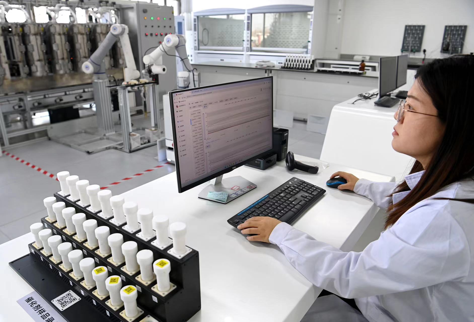 2月28日,在榆林中科潔凈能源創(chuàng)新研究院基于人工智能的高通量催化反應(yīng)研究平臺(tái)實(shí)驗(yàn)室,工藝專干黨小梅在進(jìn)行實(shí)驗(yàn)。新華社記者鄒競(jìng)一 攝
