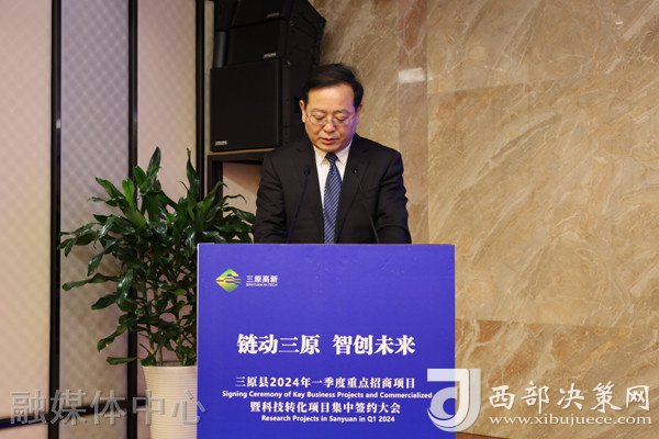 西部決策網(wǎng)訊 近日,“鏈動(dòng)三原 智創(chuàng)未來(lái)”三原縣2024年一季度重點(diǎn)招商項(xiàng)目暨科技轉(zhuǎn)化項(xiàng)目集中簽約大會(huì)在咸陽(yáng)市舉行。省市領(lǐng)導(dǎo)汪文展、李曉靜、吳進(jìn)武、仝保亞、王春霄、程文杰、曾亞龍等出席活動(dòng)??h委書(shū)記趙俊強(qiáng)致辭??h委副書(shū)記、縣長(zhǎng)楊紅剛主持??h委常委、常務(wù)副縣長(zhǎng)蒙小衛(wèi)等介紹簽約項(xiàng)目情況。投資企業(yè)、項(xiàng)目單位負(fù)責(zé)人等100余人出席活動(dòng)。