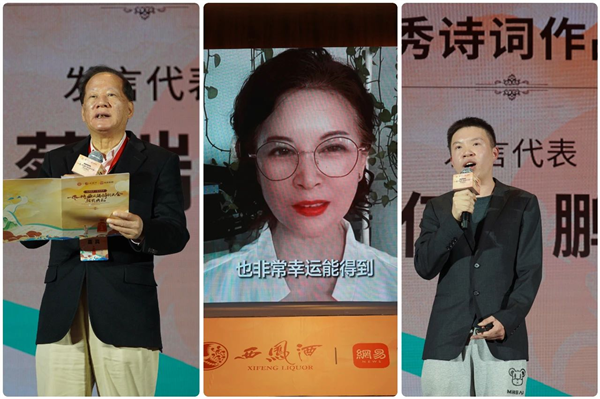 會上,王士祥、李曉東分別作了題為《詩詞山河—古典詩詞與酒》《當(dāng)代生活與傳統(tǒng)詩詞》的主題演講;網(wǎng)易文化高級主編章劍鋒公布比賽情況,與會領(lǐng)導(dǎo)為獲獎詩詞作品頒獎;獲獎代表蔡瑞義、鐘婉、伍思鵬分別作了發(fā)言;獲獎作品進(jìn)行了現(xiàn)場表演展示。