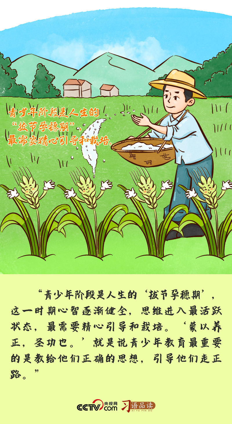 “拔節(jié)孕穗期”是禾谷類作物汲取養(yǎng)分、生長(zhǎng)發(fā)育最快的階段,也是決定這一年收成多少的重要時(shí)期,需要農(nóng)人精心照料。處在人生“拔節(jié)孕穗期”的青少年階段,也是一個(gè)人一生中世界觀、人生觀、價(jià)值觀打底塑形的關(guān)鍵時(shí)期,正確的引導(dǎo)和悉心栽培至關(guān)重要。