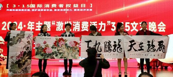 會(huì)上,任中南、馬世群等為陜西秦晉礦業(yè)集團(tuán)有限公司楊百章、陜西園晨園林綠化工程有限公司程姣姣、紅西鳳品牌運(yùn)營(yíng)公司負(fù)責(zé)人頒發(fā)了“3·15消費(fèi)維權(quán)事業(yè)貢獻(xiàn)獎(jiǎng)”獎(jiǎng)杯,田源、單克功、張寶通等與會(huì)領(lǐng)導(dǎo)嘉賓為會(huì)員單位陜西金海軒體育用品有限公司和孟凡章等企業(yè)家頒發(fā)了銅牌。企業(yè)家代表孟凡章表示,我們一定會(huì)珍惜榮譽(yù),誠(chéng)信經(jīng)營(yíng),研發(fā)新產(chǎn)品,滿足消費(fèi)者,提升服務(wù)水平。 演出環(huán)節(jié),陜西鑫越雅學(xué)藝術(shù)團(tuán)表演的舞蹈《紅日》拉開(kāi)了晚會(huì)序幕,接著,瑜伽《送你一朵小紅花》顯示著平和與堅(jiān)定,越戰(zhàn)越勇周冠軍 的男聲獨(dú)唱《中國(guó)大豐收》等激情四射,詩(shī)朗誦《我們呼喚誠(chéng)信》充滿期待,古典舞《采薇》魅力無(wú)限,特別是古裝表演《太白頌長(zhǎng)安》把演出帶向高潮,讓大家一同感受到長(zhǎng)安的古老和現(xiàn)代交織的魅力。